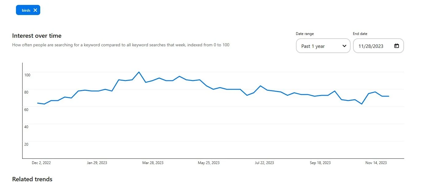 In analyzing another layer of the RAVEN’S GIFT, we discover that Claire explores the important roles that birds hold in the Bible. Not only do birds have a lot of symbolic and metaphorical importance to the story, but this feathery subplot is also just what we need to make RAVEN’S GIFT’S marketing message fly all year long. Returning to the Trends Tool, we notice above that the term “birds” pulls up a trend line that remains between 60 and 100 over the span of the entire year. Yes! The keyword “birds” is a hot topic, one that we can incorporate in all of our campaigns.