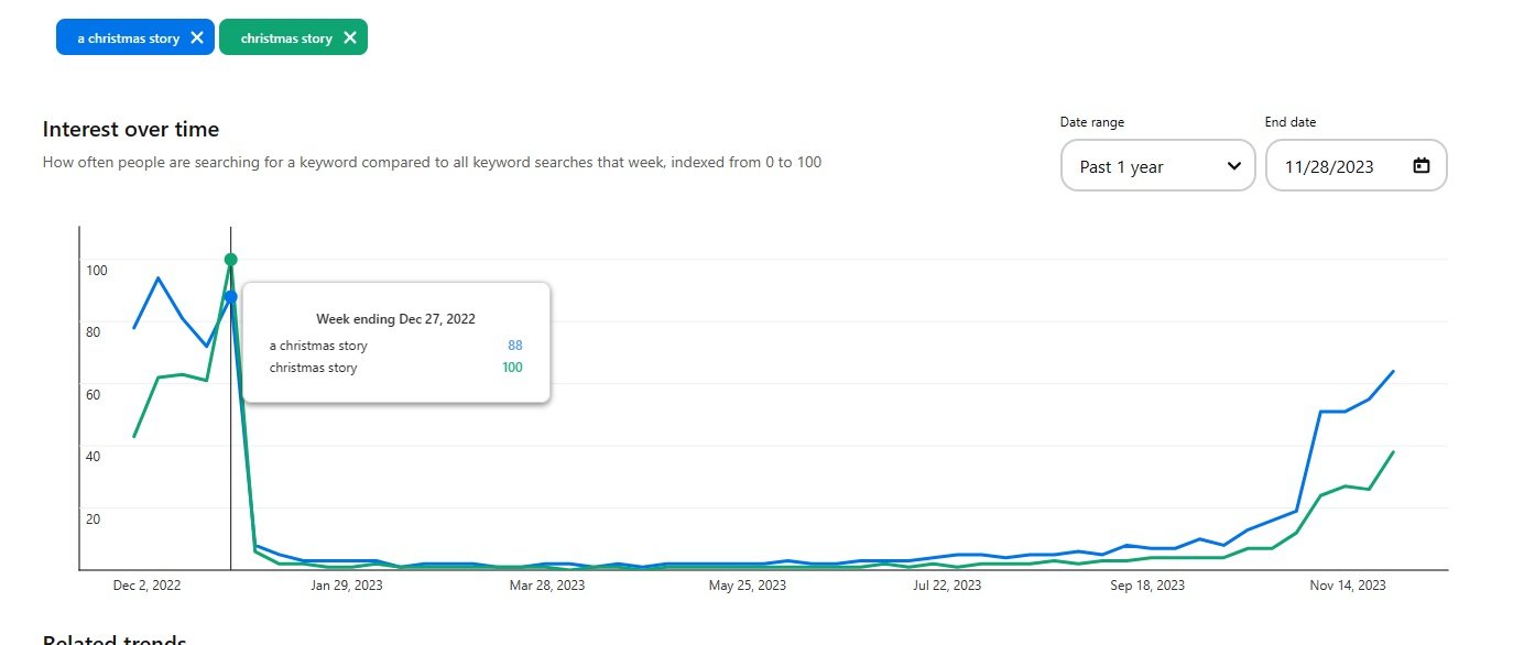 First of all, let’s see what the Trends Tool tells us about the sales window for Christmas stories. Notice, on the right side of the graph above, that Pinterest users have begun searching the terms “a Christmas Story” and “Christmas Story” in October, about the same time that RAVEN’S GIFT was launched. Moving to the left, we can see that these terms peak on December 27th, and then crash hard after that. Bah! Hum bug! Not to worry, though. The good news is that, due to the evergreen nature of Pinterest marketing, RAVEN’S GIFT will begin ranking in search again by next October. That’s nice, but we want RAVEN’S GIFT to get attention beyond December 27, 2023. Right? Back to the Trends Tool we go.