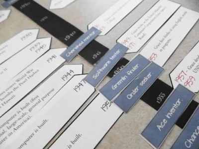 There is also a manipulative historical timeline in this guide. Because Grace’s life was so extraordinary, readers deserved an elaborate one. The dated timeline strip is documented with tabs describing key events in her life which coincide with others noting historic occurrences of the day, highlighted by labeled phrases derived from a lively list poem found in the introduction to the book. I can just imagine Grace Hopper Mini-Me’s huddled around the timeline and the other projects in the guide, exploring the life and times of this astonishing woman.